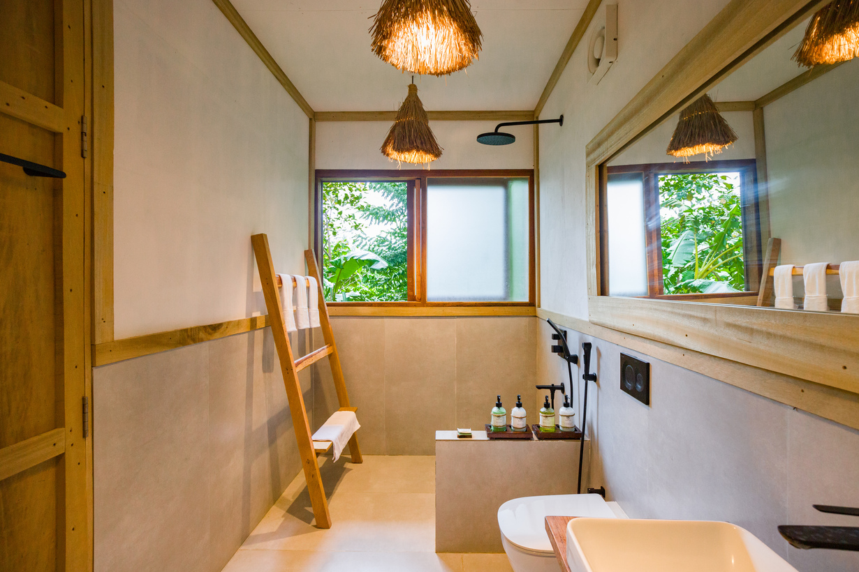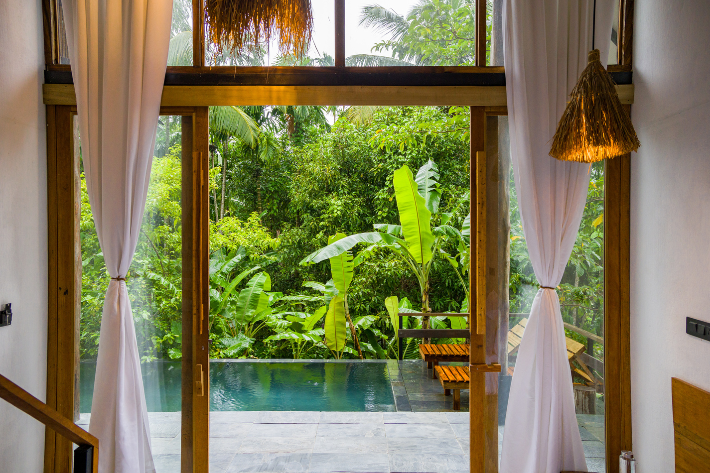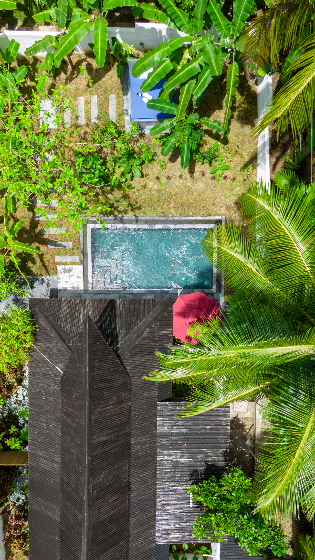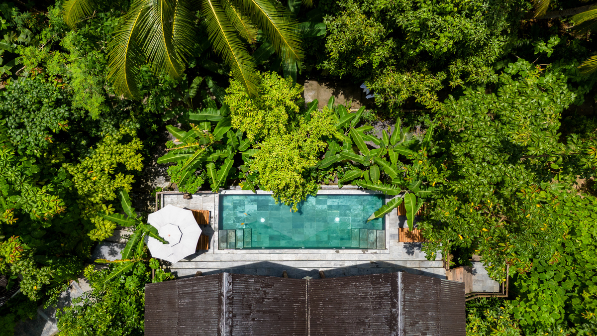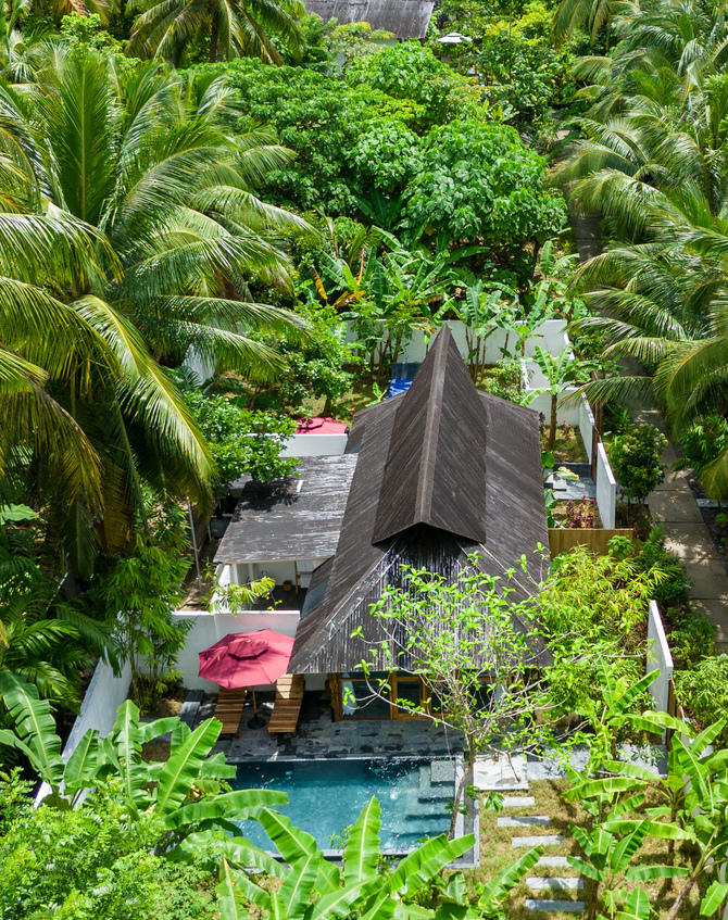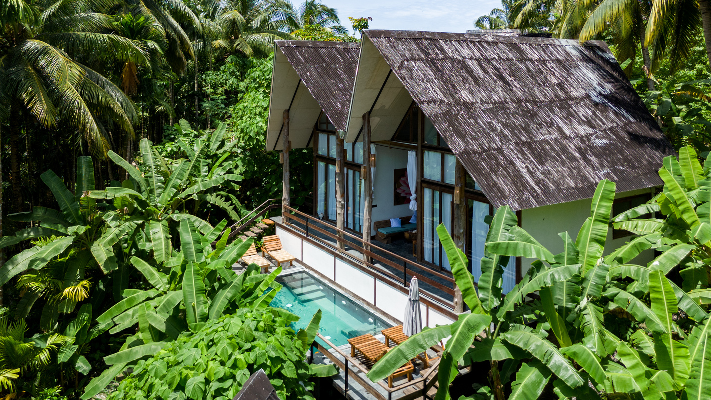 Overlooking a tropical forest, the villa offers guests ample outdoor seating and access to a private infinity pool. Villa Saal can be fully booked by four or up to eight people. A couple or up to four guests traveling together can also choose to unwind in a single duplex of the villa.